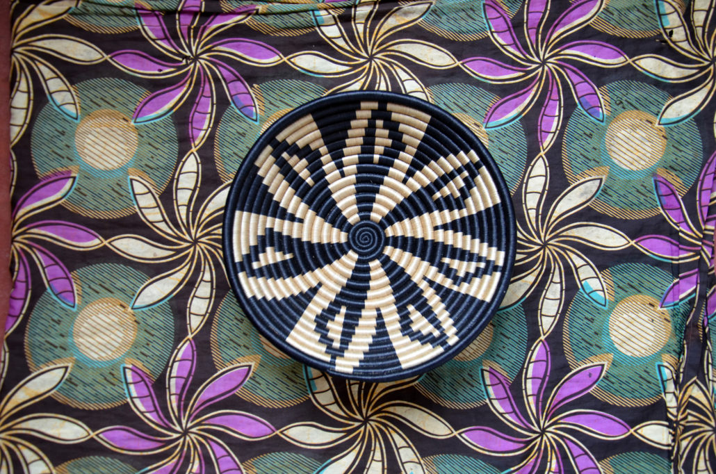 It is a challenge for most weavers to take an established pattern and weave it with perfect balance and excellence in every stitch, but Vestine sees beyond established patterns. Last year, she spotted her neighbor wearing a fabric with an interesting floral design. “May I borrow your fabric?” she asked. She began, as she always does, with a small round disc, weaving the black sisal around to create rows which spiraled outward like a snail shell. Then she wove her first spot of color, then a second spot, then a third, fourth, fifth and sixth, perfectly spaced in a circle. From there, she wove outward, the fabric’s pattern emerging with the addition of each row of weave, finishing with a row of black to enclose her design as the bowl reached its full 12 inch diameter. Her mama had a fabric which also caught her eye. Before long, Vestine had two unique bowls to bring to Azizi Life. The staff was delighted! When her new designs were adopted into Azizi Life’s new collection, Vestine sat down with the women from her weaving cooperative and taught them the new designs as well. Now they are all gaining even more fair-wage income as they weave Vestine’s designs together.