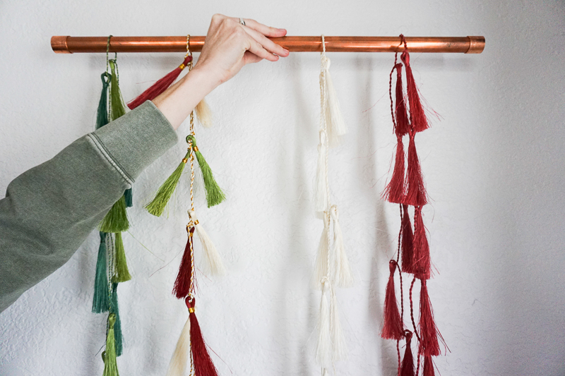 We warned you, the versatility is endless! Keep your Christmas Tassel Garlands up year-round by turning them into wall art after the holidays (or during)! Use what you already have in your home as a base – an extra curtain rod, large stick from the garden, a wooden dowel – get creative here! Next, simply drape your Christmas Tassel Garlands and hang it on the wall! There you have it, a one of a kind piece of wall art!
