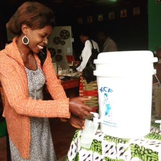 - Our newest Renewable Resource initiative is underway. We now have a stock of water filters and distribution has started. Please pray that we are able to clearly communicate the benefit and how best to use these filters to the recipients. Below is a photo of the new water filter being tested out at our office by Athanasie, an artisan who weaves banana leaf purses and headbands with Abibumbye Cooperative.