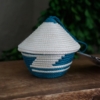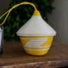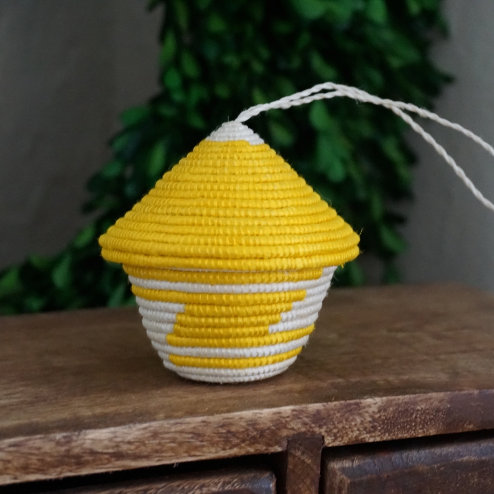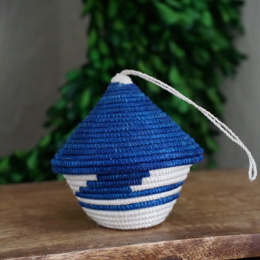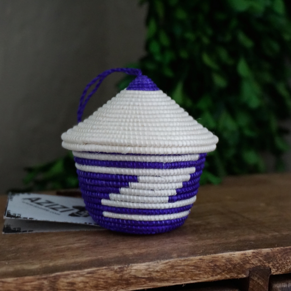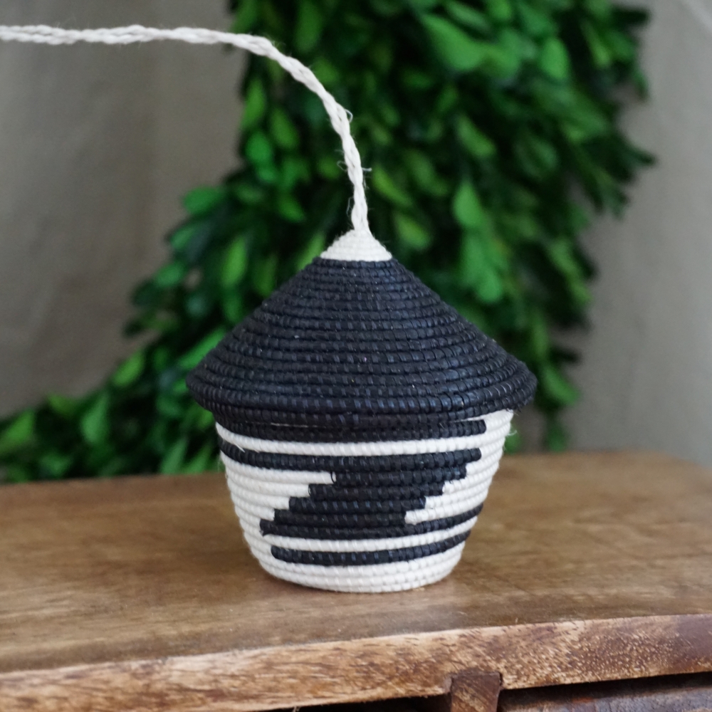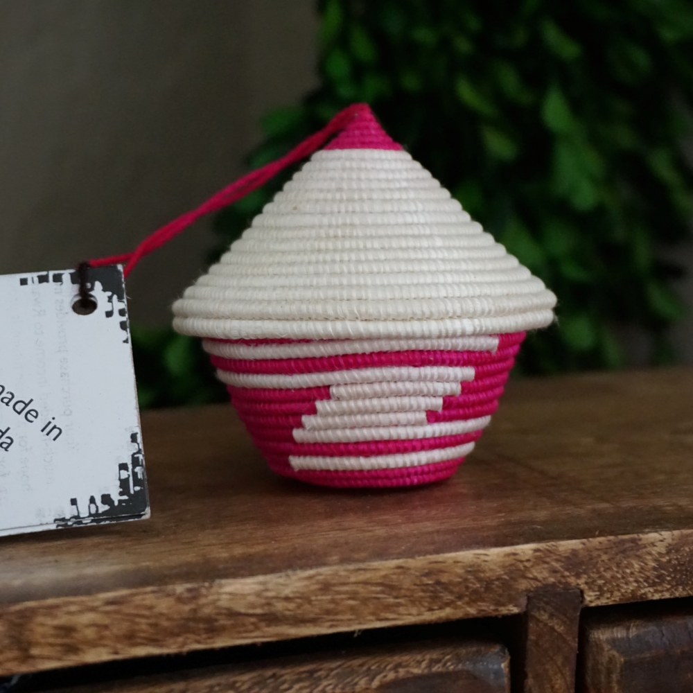 The woven basket with a pointed lid is a Rwandan cultural symbol. The traditional stripe pattern represents a path taken by friends, carrying gifts to another dear friend. These miniature baskets are a variation on that and a beautiful way to bring a piece of Rwandan tradition to your Christmas celebration.
