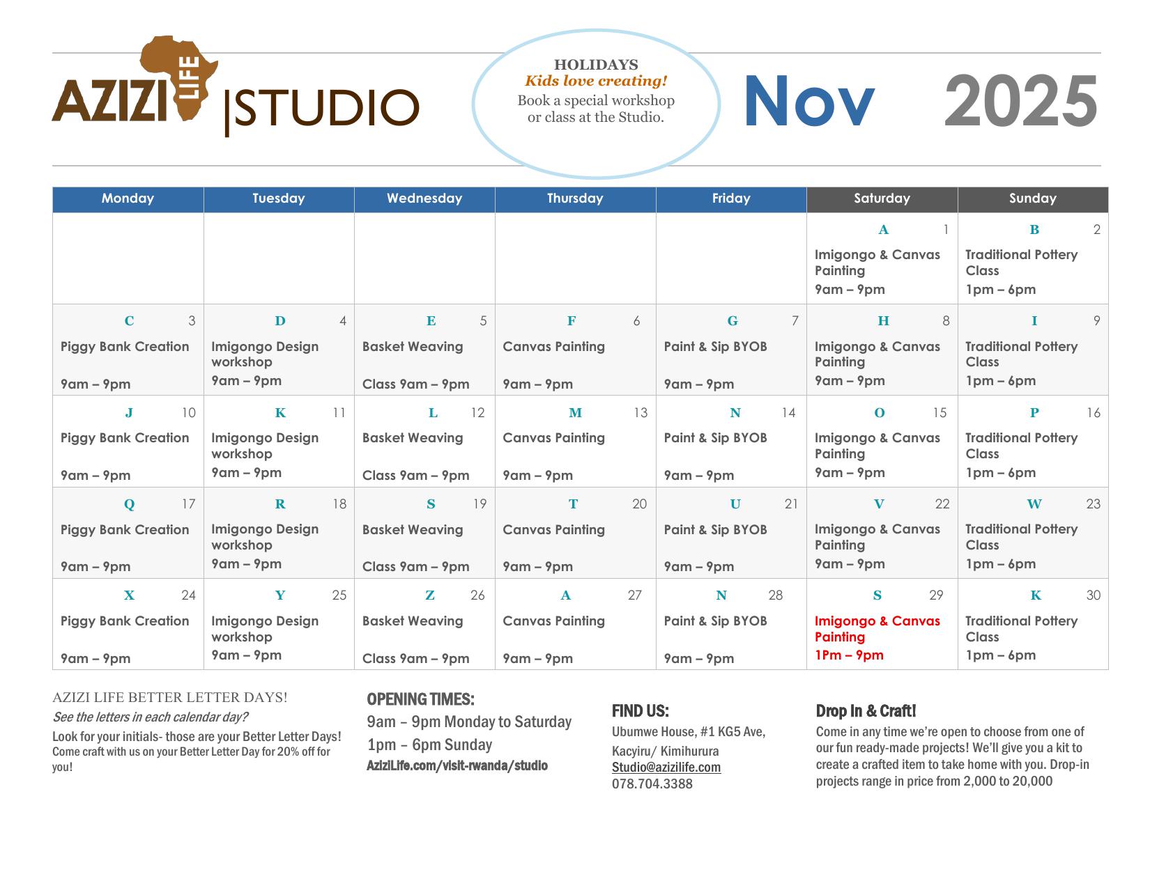 To book a workshop or class simply add it to your basket or give us a call or whatsapp on +250.787.043.388 or email studio@azizilife.com and we will arrange everything for you.